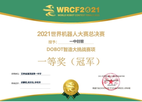 由于疫情原因,4月16-17日,2021年世界机器人大赛总决赛在线上举行,由通渭县第一中学学生南京生、谢鹏程、李明泽组成的“一中创客”队,作为甘肃省唯一一支代表队同来自全国的60多个代表队通过两天的线上精彩、激烈的角逐,通渭县第一中学代表队在“DOBOT智造大挑战(高中组)”比赛中以400分的满分成绩一举斩获全国冠军(一等奖)。