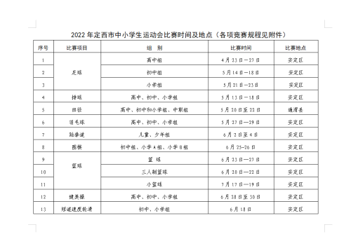 近年来,全市教育系统全面贯彻党的教育方针,认真落实《定西市关于全面加强和改进新时代学校体育工作的实施方案》要求,以立德树人为根本,以社会主义核心价值观为引领,以服务学生全面发展、增强综合素质为目标,坚持健康第一的教育理念,坚持每年举办一次全市中小学生运动会,全力推动青少年文化学习和体育锻炼协调发展,逐步形成了“一校一品”“一校多品”的学校体育发展新局面。 全市教育系统将以这次比赛为新起点,牢固树立健康第一理念,在体育锻炼中享受乐趣、增强体质、健全人格、锤炼意志,努力成长为德、智、体、美、劳全面发展的时代新人,用接续奋斗描绘和成就全市教育事业发展的新篇章! 据悉,2022年全市中小学生运动会设田径、足球、篮球、排球、乒乓球、羽毛球、武术、游泳、健美操、围棋、象棋 、跆拳道、短道速度轮滑等13个大项 367个小项,将按计划逐项举行。