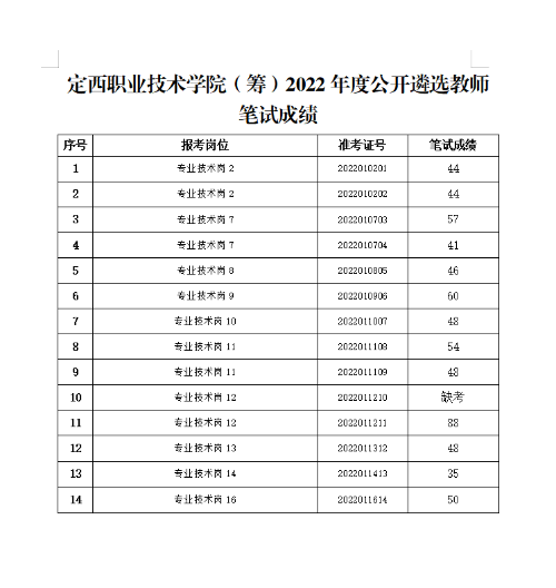 定西职业技术学院(筹)2022年度公开遴选教师笔试成绩公示 |