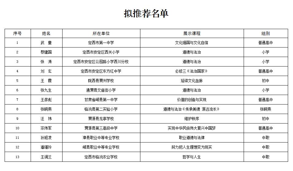 根据《中共甘肃省委宣传部 中共甘肃省委教育工作委员会关于开展第二届甘肃省大中小学思政课教师“大比武”教学展示暨精品思政课评选展示活动的通知》(甘教工委思函〔2024〕9号)要求,经县区和市属相关学校初评推荐,市教育局审核,拟推荐定西市第一中学武童等13名教师参加第二届甘肃省大中小学思政课教师“大比武”教学展示暨精品思政课评选展示活动(具体名单附后)。