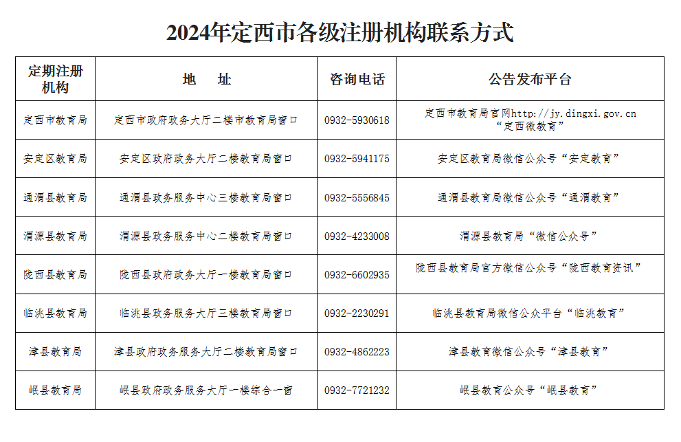 根据《教育部印发<中小学教师资格定期注册暂行办法>》《甘肃省中小学教师资格定期注册实施细则(2024年修订)》《甘肃省2024年中小学教师资格定期注册公告》等有关规定,现将定西市2024年中小学教师资格定期注册工作有关事项公告如下。 一、注册对象 我市公办普通中小学、中等职业学校、幼儿园、特殊教育学校、其他教育机构的在编在岗教师(含国家“特岗教师”、“三支一扶”招考教师以及甘肃省政府“民生实事”招考教师、经县级以上政府批准招聘的各类聘用制教师),承担教学任务并评聘教师专业技术职务的学校校级领导和其他管理人员;依法举办的民办普通中小学、中等职业学校、幼儿园中签订正式聘用合同的在岗教师。 二、注册条件 (一)首次注册的条件 1.遵守国家法律法规和《中小学教师职业道德规范》、新时代教师职业行为十项准则等师德师风各项规定要求,有良好的师德表现。 2.具有与任教岗位相应的教师资格; 3.聘用为中小学在编在岗教师; 4.身心健康,胜任教育教学工作。 首次任教人员申请注册须试用期满且考核合格。经首次注册后,每5年进行一次定期注册。 (二)定期注册的条件 1.遵守国家法律法规和《中小学教师职业道德规范》、新时代教师职业行为十项准则等师德师风各项规定要求,有良好的师德表现。 2.具有与任教岗位相应的教师资格; 3.每年年度考核合格及其以上等次; 4.每个注册有效期内完成不少于国家或省教育行政部门认可的360个培训学时; 5.身心健康,胜任教育教学工作。 (三)有下列情形之一的,暂缓定期注册 1.注册有效期内未完成国家或省教育行政部门认可的360个培训学时者暂缓注册。达到规定学时后,在下一年度申请注册。 2.中止教育教学和教育管理工作一学期以上者暂缓注册,但经所在学校或教育行政部门批准的进修、培训、学术交流、病休、产假等情形除外。中止教育教学和教育管理工作一学期以上两学年以内,恢复教育教学和教育管理工作、达到注册条件的,在下一年度申请注册;中止教育教学和教育管理工作两学年及以上,恢复教育教学和管理工作一年后,在下一年度申请注册。 3.一个注册周期内任何一年年度考核不合格。暂缓注册一年,暂缓期内考核合格,达到注册条件的,在下一年度申请注册。 (四)有下列情形之一的,定期注册为不合格 1.违反《中小学教师职业道德规范》《新时代教师职业行为十项准则》等师德师风各项规定要求和师德考核评价标准,影响恶劣; 2.一个定期注册周期内连续两年以上(含两年)或累计两年及以上年度考核不合格; 3.依法被撤销或丧失教师资格。 三、定期注册提交材料 (一)《教师资格定期注册申请表》一式两份; (二)《教师资格证书》原件; (三)申请人所在学校或主管部门聘用合同复印件; (四)任教学校(单位)出具的师德表现证明; (五)任教学校(单位)出具的注册期内近5年的年度考核证明: (六)省级教育行政部门认可的教师培训证明(继续教育证书); (七)身心状况可以正常从事教育教学工作的证明,经中小学或教育行政部门批准病休的,须提供病休证明。 初次聘用为中小学教师申请办理首次注册时,需提交上述(一)(二)(四)(七)项材料,同时提交试用期考核合格证明(服务期内“特岗教师”、“三支一扶”招考教师等项目人员,不执行试用期规定的除外)。暂缓注册后重新申请的人员,应提交情形消失证明或者有关情况改正补充证明。 四、注册程序 中小学教师资格定期注册实行网上申请。由本人申请、所在学校(单位)集体办理,按照人事隶属关系报县级以上教育行政部门审核注册。定西市体育运动学校、定西一中、定西市幼儿园定期注册工作由安定区教育局负责初审,临洮农校定期注册由临洮县教育局负责初审。凡属于我市规定注册范围内的教师,应在教育行政部门受理期限内申请教师资格定期注册。 (一)符合注册条件的中小学教师在规定的时间内,访问中国教师资格网(www.jszg.edu.cn),点击“网上办事”-“中小学教师资格定期注册”右边的“在线办理”图标进入网上申报系统,遵循网上申报流程填写个人信息,完成定期注册信息填报后,下载打印《教师资格定期注册申请表》,与定期注册要求的其他相关材料一并交学校(单位)。 (二)学校(单位)要在规定时间内,对本校(单位)教师提交的定期注册申请材料进行审核并签署意见,由学校(单位)集中统一报送当地县区教育行政部门进行审核。 (三)县区教育行政部门负责申报材料的初审,提出初审注册结论并公示(不少于5个工作日),在教师资格管理信息系统中填报初审结论;市教育局负责申报工作的复核,在教师资格管理信息系统中填报复核结论;省教育厅对注册申请进行终审。 (四)经县级初审、市级复核、省级终审后,由县区教育行政部门(初审机构)依据终审结果,将申请人定期注册结论在《教师资格定期注册申请表》中标注,该申请表一份存入申请人人事档案,一份由初审机构归档保存。 五、时间安排 2024年我市中小学教师定期注册工作总时间段为9月14日至12月2日,各级具体工作时间安排: 1.个人申报9月14日-10月7日 2.学校确认10月8日-10月31日 3.县级初审11月1日-11月15日 4.市级复核11月16日-12月2日 六、其他事项 (一)本公告发布后,各县区教育行政部门要及时发布当地定期注册公告,申请人须关注并及时查阅,避免错过时间。 (